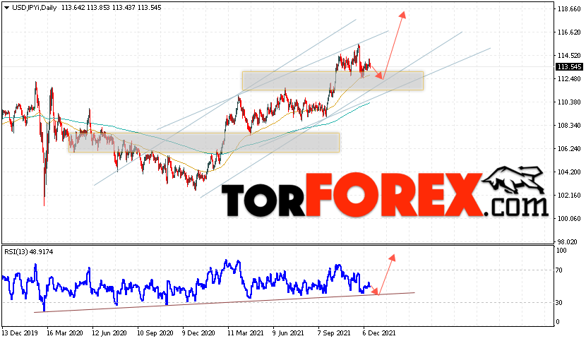 Дополнительным сигналом в пользу подъёма пары Доллар Иена на текущий торговой неделе выступит тест восходящей линии тренда на индикаторе относительной силы. Вторым сигналом станет отскок от нижней границы бычьего канала. Отменой варианта подъёма пары USD/JPY на текущей торговой неделе 20 — 24 декабря 2021 выступит падение и пробой области 109.45. Такой вариант укажет на пробой области поддержки и продолжение падения пары на Форекс в область ниже уровня 106.25. Подтверждением подъёма по паре USD/JPY выступит пробой области сопротивления и закрытие цены над уровнем 115.55.