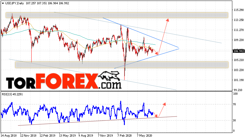 Дополнительным сигналом в пользу роста пары Доллар Иена на текущий торговой неделе выступит тест линии тренда на индикаторе относительной силы. Вторым сигналом станет отскок от уровня поддержки на графике цены. Отменой варианта роста пары USD/JPY на текущей торговой неделе 20 — 24 июля 2020 выступит падение и пробой области 104.75. Такой вариант укажет на пробой области поддержки и продолжение падения пары на Форекс в область ниже уровня 101.05. Подтверждением роста по паре USD/JPY выступит пробой области сопротивления и закрытие над уровнем 109.45, что укажет на пробой верхней границы модели «Треугольник».