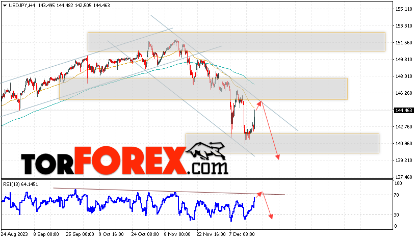Котировки валютной пары Доллар Иена USD/JPY продолжают движение в рамках развития коррекции и нисходящего канала. В момент публикации прогноза курс Доллара США к Японской Иене составляет 144.46. Скользящие средние указывают на наличие краткосрочной медвежьей тенденции по паре. Цены пробили область между сигнальными линиями вниз, что указывает на давление со стороны продавцов Доллара США и потенциальное продолжение падения цен уже с текущих уровней. В рамках прогноза курса Японской Иены на 20 декабря 2023 стоит ожидать попытку развития подъёма цены и тест области сопротивления вблизи уровня 145.15. Далее, отскок цены вниз и продолжение падения пары USD/JPY в область ниже уровня 139.35.