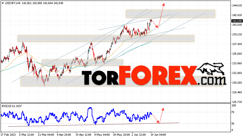Котировки валютной пары Доллар Иена USD/JPY продолжают движение в рамках роста и бычьего канала. В момент публикации прогноза курс Доллара США к Японской Иене составляет 141.69. Скользящие средние указывают на наличие краткосрочной бычьей тенденции по паре. Цены пробили область между сигнальными линиями вверх, что указывает на давление со стороны покупателей Доллара США и потенциальное продолжение роста цен уже с текущих уровней. В рамках прогноза курса Японской Иены на 20 июня 2023 стоит ожидать попытку развития коррекции цены и тест области поддержки вблизи уровня 140.65. Далее, отскок цены вверх и продолжение роста пары USD/JPY в область выше уровня 144.75.