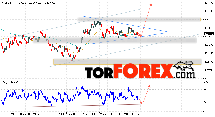 Котировки валютной пары Доллар Иена USD/JPY продолжают движение в рамках коррекции и формирования модели ”Треугольник». В момент публикации прогноза курс Доллара США к Японской Иене составляет 103.76. Скользящие средние указывают на наличие краткосрочной бычьей тенденции по паре. Цены вновь тестируют область между сигнальными линиями, что указывает на давление со стороны покупателей Доллара США и потенциальное продолжение роста цен уже с текущих уровней. В рамках прогноза курса Японской Иены на 21 января 2021 стоит ожидать попытку развития коррекции и тест области поддержки вблизи уровня 103.60. Далее, отскок и продолжение роста пары USD/JPY в область выше уровня 105.25.