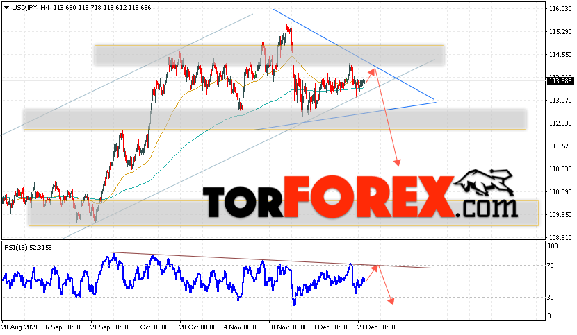 Таким образом, USD/JPY прогноз Доллар Иена на 22 декабря 2021 предполагает попытку теста области сопротивления вблизи уровня 114.25. Затем, продолжение падения котировок в область ниже уровня 110.85. В пользу снижения пары выступит тест линии тренда на индикаторе относительной силы. Отменой варианта падения станет сильный рост и пробой области 115.45. Это укажет на пробой уровня сопротивления и продолжение подъёма по паре с потенциальной целью выше уровня 117.65.