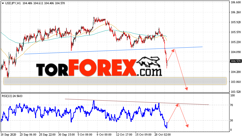 Таким образом, USD/JPY прогноз Доллар Иена на 22 октября 2020 предполагает попытку теста области сопротивления вблизи уровня 104.95. Затем, продолжение падения котировок в область ниже уровня 103.55. В пользу снижения пары выступит тест линии тренда на индикаторе относительной силы. Отменой варианта падения станет сильный рост и пробой области 105.95. Это укажет на пробой уровня сопротивления и продолжение роста по паре с потенциальной целью выше уровня 107.45.