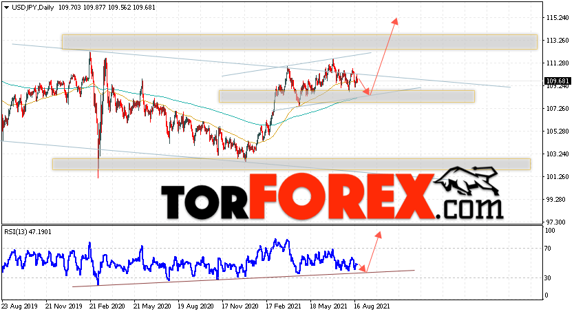 Дополнительным сигналом в пользу подъёма пары Доллар Иена на текущий торговой неделе выступит тест восходящей линии тренда на индикаторе относительной силы. Вторым сигналом станет отскок от нижней границы границы. Отменой варианта подъёма пары USD/JPY на текущей торговой неделе 23 — 27 августа 2021 выступит падение и пробой области 107.05. Такой вариант укажет на пробой области поддержки и продолжение падения пары на Форекс в область ниже уровня 104.05. Подтверждением подъёма по паре USD/JPY выступит пробой области сопротивления и закрытие цены над уровнем 111.35.