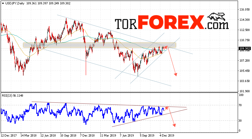 В пользу снижения пары Доллар Иена выступит тест линии сопротивления на индикаторе относительной силы. Вторым сигналом станет отскок от верхней границы нисходящего канала. Отменой варианта падения пары USD/JPY на текущей торговой неделе 23 — 27 декабря 2019 выступит сильный рост и пробой области 111.05. Такой вариант укажет на пробой области сопротивления и продолжение роста пары на Форекс в область выше уровня 113.75. Подтверждением падения по паре USD/JPY выступит пробой нижней границы восходящего канала и закрытие под уровнем 107.25.
