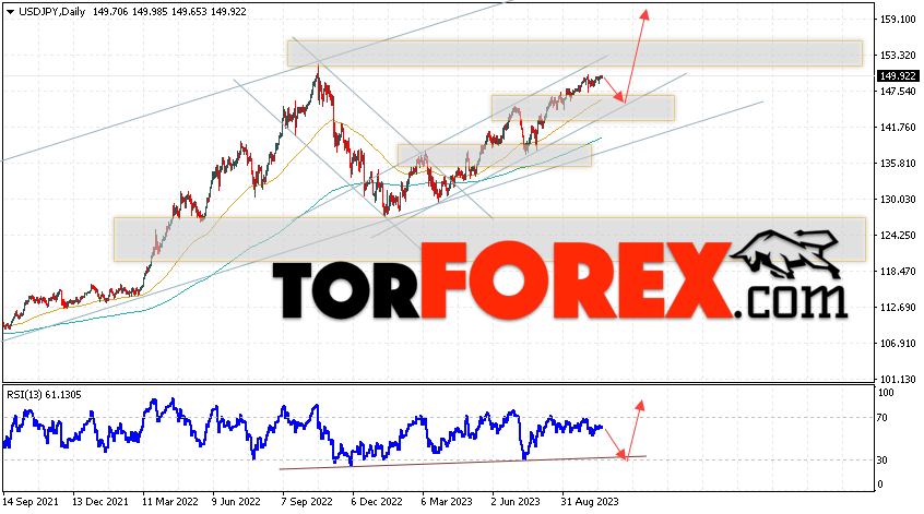 Дополнительным сигналом в пользу подъёма пары Доллар Иена на текущий торговой неделе выступит тест бычьей линии тренда на индикаторе относительной силы. Вторым сигналом станет отскок от нижней границы бычьего канала. Отменой варианта роста пары USD/JPY на текущей торговой неделе 23 — 27 октября 2023 выступит падение и пробой области 142.75. Такой вариант укажет на пробой области поддержки и продолжение падения пары на Форекс в область ниже уровня 139.35. Подтверждением росту по паре USD/JPY выступит пробой области сопротивления и закрытие цены над уровнем 153.05.