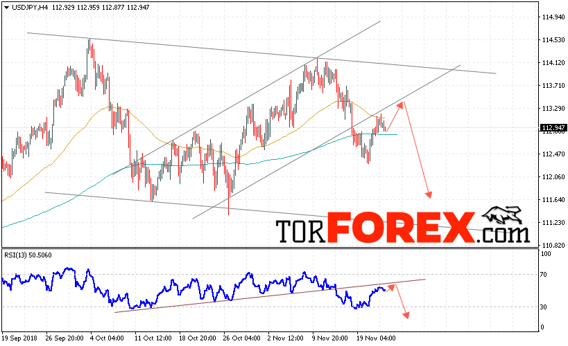 Таким образом, USD/JPY прогноз Доллар Иена на 23 ноября 2018 предполагает попытку теста области сопротивления вблизи уровня 113.35. Затем продолжение падения котировок в область ниже уровня 111.65. В пользу снижения пары выступит тест линии тренда на индикаторе относительной силы. Отменой варианта падения станет сильный рост и пробой области 113.75. Это укажет на пробой области сопротивления и продолжение восходящего движения по паре.