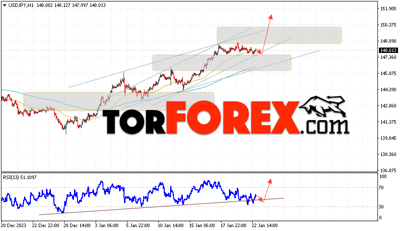 Котировки валютной пары Доллар Иена USD/JPY продолжают движение в рамках развития роста и бычьего канала. В момент публикации прогноза курс Доллара США к Японской Иене составляет 148.01. Скользящие средние указывают на наличие краткосрочной бычьей тенденции по паре. Цены пробили область между сигнальными линиями вверх, что указывает на давление со стороны покупателей Доллара США и потенциальное продолжение роста цен уже с текущих уровней. В рамках прогноза курса Японской Иены на 23 января 2024 стоит ожидать попытку развития коррекции цены и тест области поддержки вблизи уровня 147.75. Далее, отскок цены вверх и продолжение роста пары USD/JPY в область выше уровня 151.65.