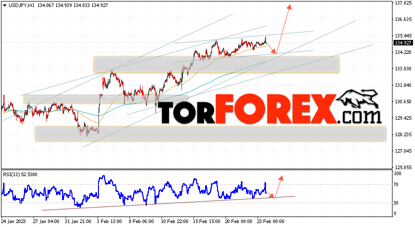 Котировки валютной пары Доллар Иена USD/JPY продолжают движение в рамках роста и бычьего канала. В момент публикации прогноза курс Доллара США к Японской Иене составляет 134.92. Скользящие средние указывают на наличие краткосрочной бычьей тенденции по паре. Цены ушли вверх от области между сигнальными линиями, что указывает на давление со стороны покупателей Доллара США и потенциальное продолжение роста цен уже с текущих уровней. В рамках прогноза курса Японской Иены на 24 февраля 2023 стоит ожидать попытку развития снижения и тест области поддержки вблизи уровня 134.25. Далее, отскок цены вверх и продолжение роста пары USD/JPY в область выше уровня 137.85.