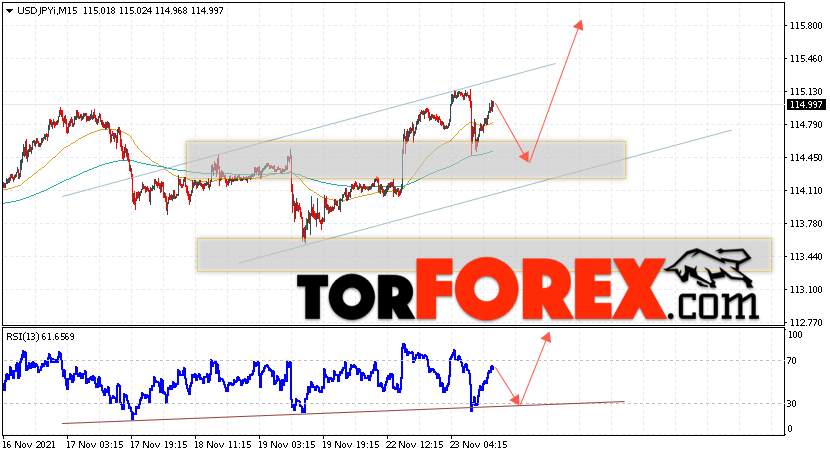 Котировки валютной пары Доллар Иена USD/JPY продолжают движение в рамках подъёма и бычьего канала. В момент публикации прогноза курс Доллара США к Японской Иене составляет 114.99. Скользящие средние указывают на наличие краткосрочной бычьей тенденции по паре. Цены пробили область между сигнальными линиями вверх, что указывает на давление со стороны покупателей Доллара США и потенциальное продолжение подъёма цен уже с текущих уровней. В рамках прогноза курса Японской Иены на 24 ноября 2021 стоит ожидать попытку развития коррекции и тест области поддержки вблизи уровня 114.35. Далее, отскок вверх и продолжение роста пары USD/JPY в область выше уровня 115.95.