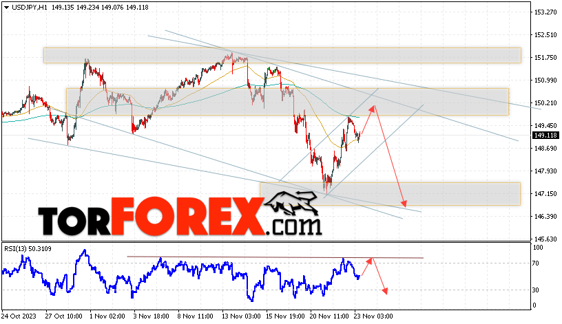 Котировки валютной пары Доллар Иена USD/JPY продолжают движение в рамках развития сильной бычьей коррекции медвежьего канала. В момент публикации прогноза курс Доллара США к Японской Иене составляет 149.11. Скользящие средние указывают на наличие краткосрочной медвежьей тенденции по паре. Цены вновь тестируют область между сигнальными линиями, что указывает на давление со стороны продавцов Доллара США и потенциальное продолжение падения цен уже с текущих уровней. В рамках прогноза курса Японской Иены на 24 ноября 2023 стоит ожидать попытку развития роста цены и тест области сопротивления вблизи уровня 149.70. Далее, отскок цены вниз и продолжение падения пары USD/JPY в область ниже уровня 146.75.