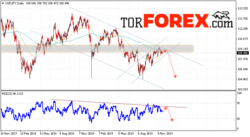 В пользу снижения пары Доллар Иена выступит тест линии сопротивления на индикаторе относительной силы. Вторым сигналом станет отскок от верхней границы нисходящего канала. Отменой варианта падения пары USD/JPY на текущей торговой неделе 25 — 29 ноября 2019 выступит сильный рост и пробой области 110.65. Такой вариант укажет на пробой области сопротивления и продолжение роста пары на Форекс в область выше уровня 112.95. Подтверждением падения по паре USD/JPY выступит пробой нижней границы восходящего канала и закрытие под уровнем 106.95.