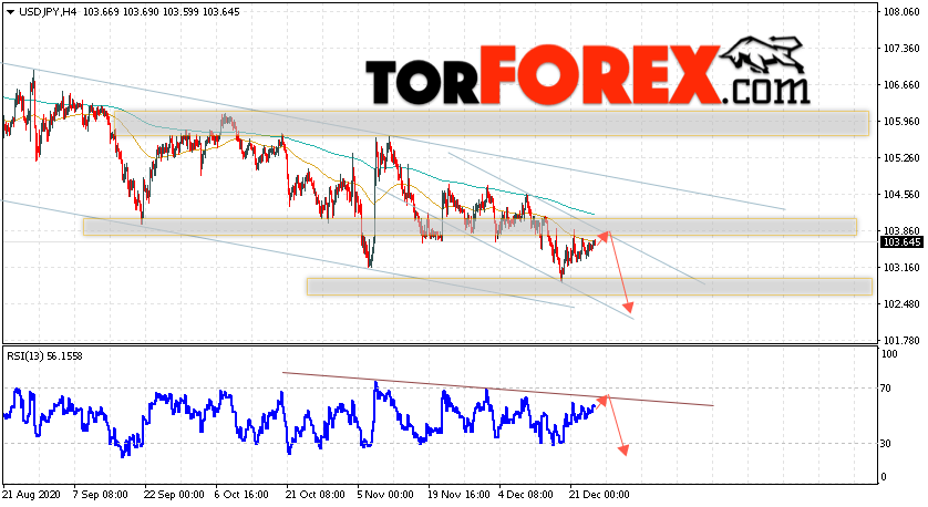 Таким образом, USD/JPY прогноз Доллар Иена на 25 декабря 2020 предполагает попытку теста области сопротивления вблизи уровня 103.95. Затем, продолжение падения котировок в область ниже уровня 102.25. В пользу снижения пары выступит тест линии тренда на индикаторе относительной силы. Отменой варианта падения станет сильный рост и пробой области 104.65. Это укажет на пробой уровня сопротивления и продолжение роста по паре с потенциальной целью выше уровня 107.45.