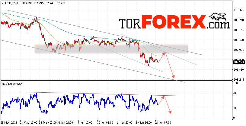 Котировки валютной пары Доллар Иена USD/JPY продолжают движение в рамках коррекции и нисходящего канала. В момент публикации прогноза курс Доллара США к Японской Иене составляет 107.27. Скользящие средние указывают на наличие краткосрочной нисходящей тенденции по паре. В рамках прогноза курса Японской Иены на 25 июня 2019 стоит ожидать попытку роста и тест области сопротивления вблизи уровня 107.65. Далее, отскок и продолжение снижения пары USD/JPY в область ниже уровня 106.20.