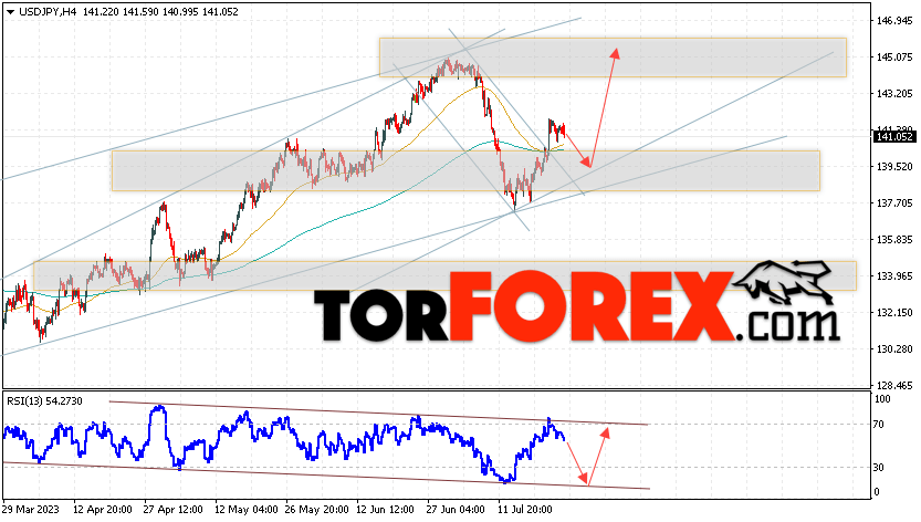 Котировки валютной пары Доллар Иена USD/JPY продолжают движение в рамках коррекции и покинули пределы медвежьего канала коррекции. В момент публикации прогноза курс Доллара США к Японской Иене составляет 141.05. Скользящие средние указывают на наличие краткосрочной бычьей тенденции по паре. Цены пробили вверх область между сигнальными линиями, что указывает на давление со стороны покупателей Доллара США и потенциальное продолжение падения цен уже с текущих уровней. В рамках прогноза курса Японской Иены на 26 июля 2023 стоит ожидать попытку развития коррекции цены и тест области поддержки вблизи уровня 139.65. Далее, отскок цены вверх и продолжение роста пары USD/JPY в область выше уровня 145.15.