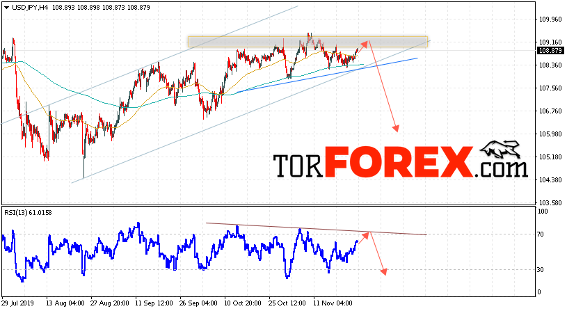 Таким образом, USD/JPY прогноз Доллар Иена на 26 ноября 2019 предполагает попытку теста области сопротивления вблизи уровня 109.15. Затем, продолжение падения котировок в область ниже уровня 105.95. В пользу подъёма пары выступит тест линии тренда на индикаторе относительной силы. Отменой варианта падения станет сильный рост и пробой области 109.95. Это укажет на пробой уровня сопротивления и продолжение развития восходящего движения по паре с потенциальной целью выше уровня 112.85.