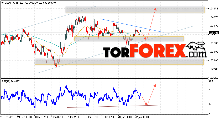 Таким образом, USD/JPY прогноз Доллар Иена на 26 января 2021 предполагает попытку теста области поддержки вблизи уровня 103.45. Затем, продолжение роста котировок в область выше уровня 104.75. В пользу подъёма пары выступит тест линии тренда на индикаторе относительной силы. Отменой варианта роста станет падение и пробой области 102.95. Это укажет на пробой уровня поддержки и продолжение падения по паре с потенциальной целью ниже уровня 100.45.