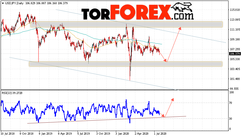 Дополнительным сигналом в пользу роста пары Доллар Иена на текущий торговой неделе выступит тест линии тренда на индикаторе относительной силы. Вторым сигналом станет отскок от уровня поддержки на графике цены. Отменой варианта роста пары USD/JPY на текущей торговой неделе 27 — 31 июля 2020 выступит падение и пробой области 103.05. Такой вариант укажет на пробой области поддержки и продолжение падения пары на Форекс в область ниже уровня 101.05. Подтверждением роста по паре USD/JPY выступит пробой области сопротивления и закрытие над уровнем 109.25.
