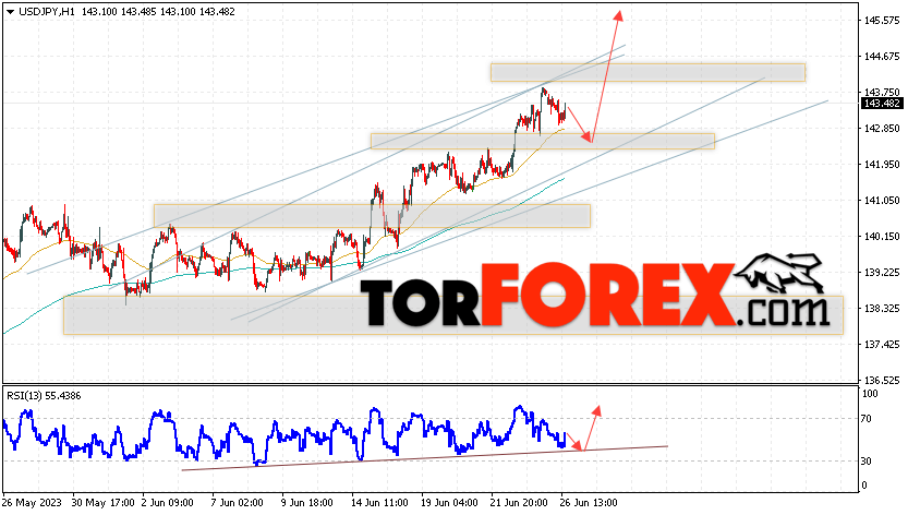 Котировки валютной пары Доллар Иена USD/JPY продолжают движение в рамках роста и бычьего канала. В момент публикации прогноза курс Доллара США к Японской Иене составляет 143.48. Скользящие средние указывают на наличие краткосрочной бычьей тенденции по паре. Цены ушли вверх от области между сигнальными линиями, что указывает на давление со стороны покупателей Доллара США и потенциальное продолжение роста цен уже с текущих уровней. В рамках прогноза курса Японской Иены на 27 июня 2023 стоит ожидать попытку развития коррекции цены и тест области поддержки вблизи уровня 142.65. Далее, отскок цены вверх и продолжение роста пары USD/JPY в область выше уровня 145.75.