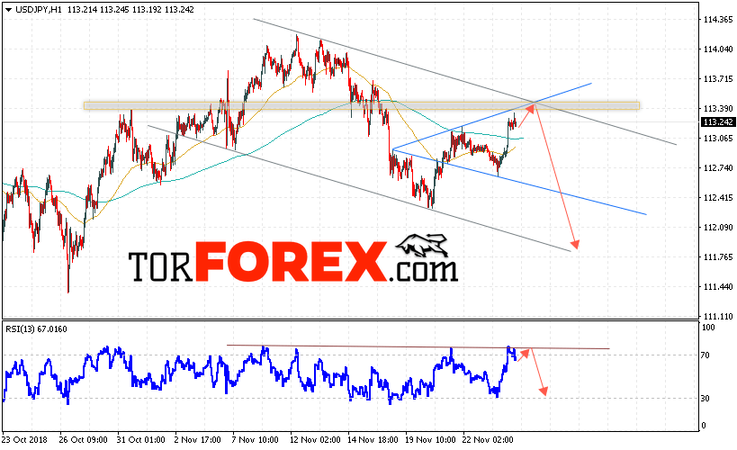 Таким образом, USD/JPY прогноз Доллар Иена на 27 ноября 2018 предполагает попытку теста области сопротивления вблизи уровня 113.40. Затем продолжение падения котировок в область ниже уровня 111.75. В пользу снижения пары выступит тест линии тренда на индикаторе относительной силы. Отменой варианта падения станет сильный рост и пробой области 113.80. Это укажет на пробой области сопротивления и продолжение восходящего движения по паре.