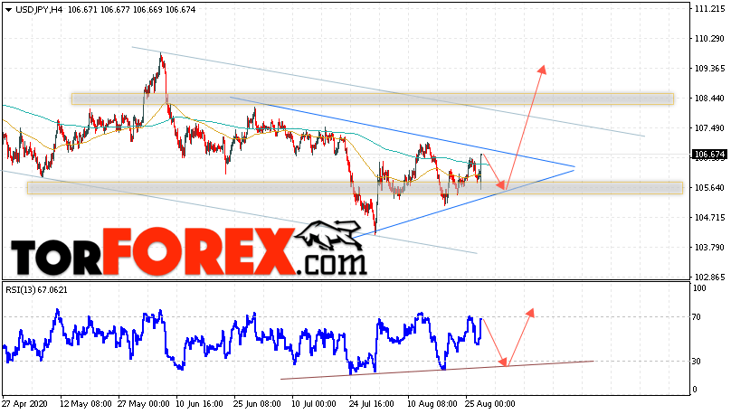 Котировки валютной пары Доллар Иена USD/JPY продолжают движение в рамках коррекции и формирования модели «Треугольник». В момент публикации прогноза курс Доллара США к Японской Иене составляет 106.67. Скользящие средние указывают на наличие краткосрочной медвежьей тенденции по паре. Однако цены пробили область между сигнальными линиями вверх, что указывает на давление со стороны покупателей Доллара США и потенциальное продолжение роста цен. В рамках прогноза курса Японской Иены на 28 августа 2020 стоит ожидать попытку развития коррекции и тест области поддержки вблизи уровня 105.75. Далее, отскок и продолжение роста пары USD/JPY в область выше уровня 109.45 в рамках модели.