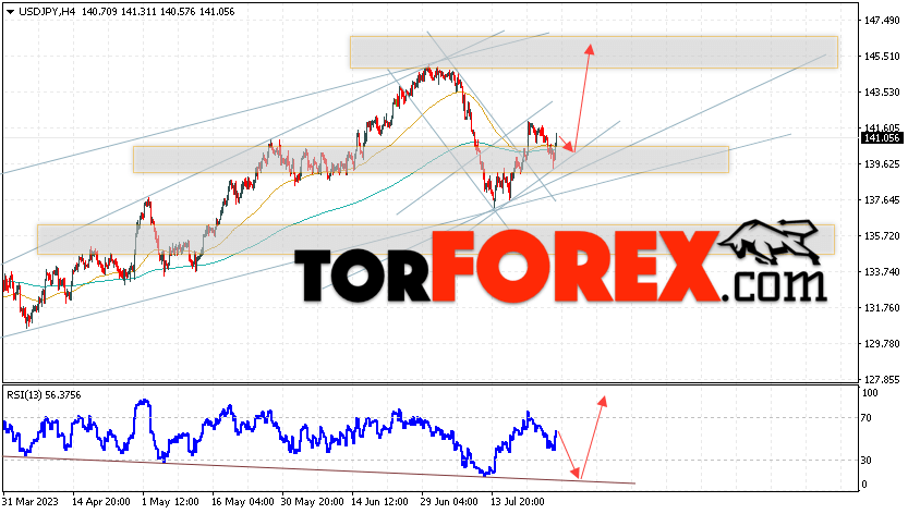 Котировки валютной пары Доллар Иена USD/JPY продолжают движение в рамках роста и бычьего канала. В момент публикации прогноза курс Доллара США к Японской Иене составляет 141.05. Скользящие средние указывают на наличие краткосрочной бычьей тенденции по паре. Цены пробили область между сигнальными линиями вниз, что указывает на давление со стороны продавцов Доллара США и потенциальное продолжение падения цен уже с текущих уровней. В рамках прогноза курса Японской Иены на 28 июля 2023 стоит ожидать попытку развития коррекции цены и тест области поддержки вблизи уровня 139.85. Далее, отскок цены вверх и продолжение роста пары USD/JPY в область выше уровня 145.65.