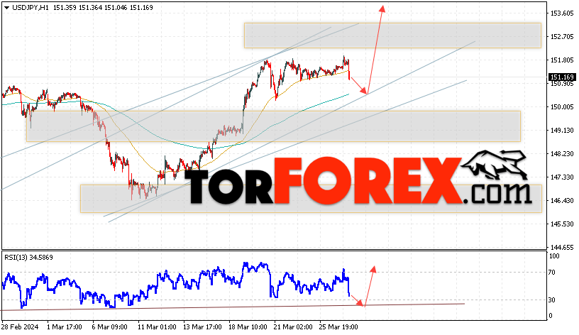 Котировки валютной пары Доллар Иена USD/JPY продолжают движение в рамках развития роста и бычьего канала. В момент публикации прогноза курс Доллара США к Японской Иене составляет 151.16. Скользящие средние указывают на наличие краткосрочной бычьей тенденции по паре. Цены пробили область между сигнальными линиями вверх, что указывает на давление со стороны покупателей Доллара США и потенциальное продолжение роста цен уже с текущих уровней. В рамках прогноза курса Японской Иены на 28 марта 2024 стоит ожидать попытку развития коррекции цены и тест области поддержки вблизи уровня 150.75. Далее, отскок цены вверх и продолжение роста пары USD/JPY в область выше уровня 153.65.