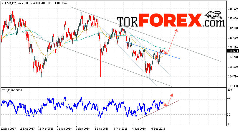 В пользу подъёма пары Доллар Иена выступит тест линии поддержки на индикаторе относительной силы. Вторым сигналом станет отскок от линии «Шеи» разворотной модели «Голова и плечи». Отменой варианта роста пары USD/JPY на текущей торговой неделе 28 октября — 1 ноября 2019 выступит падение и пробой области 106.05. Такой вариант укажет на пробой области поддержки и продолжение снижения пары на Форекс в область ниже уровня 103.35. Подтверждением роста по паре USD/JPY выступит пробой верхней границы нисходящего канала и закрытие над уровнем 109.45.