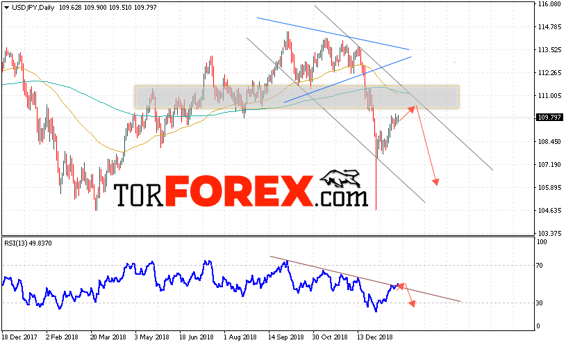 В пользу падения пары Доллар Иена выступит тест нисходящей линии тренда на индикаторе относительной силы. А также отскок от верхней границы нисходящего канала. Отменой варианта снижения пары USD/JPY на текущей торговой неделе 28 января — 1 февраля 2019 станет сильный рост и пробой области 111.15. Такой вариант укажет на пробой верхней границы канала и продолжение роста пары на Форекс в область выше уровня 114.45. Подтверждением развития нисходящей тенденции по паре USD/JPY выступит пробой области поддержки и закрытие ниже уровня 108.45.