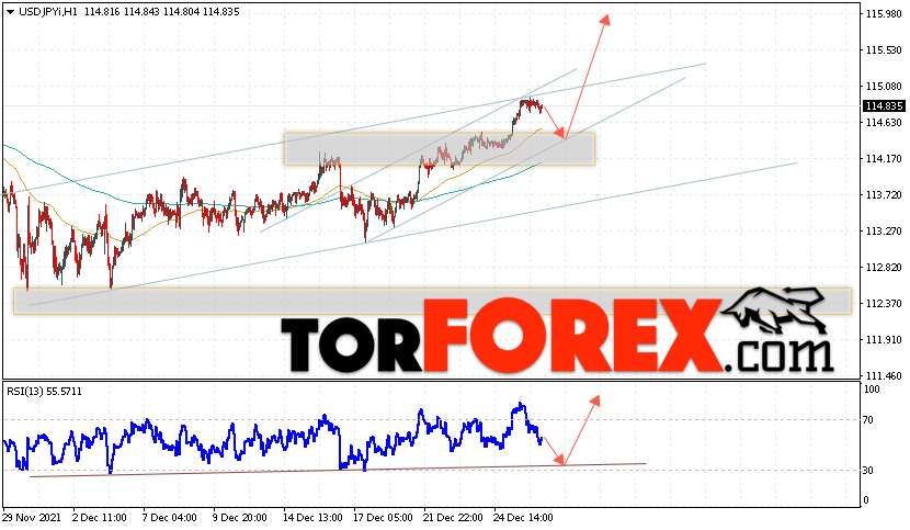 Котировки валютной пары Доллар Иена USD/JPY продолжают движение в рамках роста и бычьего канала. В момент публикации прогноза курс Доллара США к Японской Иене составляет 114.83. Скользящие средние указывают на наличие краткосрочной бычьей тенденции по паре. Цены ушли вверх от области между сигнальными линиями, что указывает на давление со стороны покупателей Доллара США и потенциальное продолжение роста цен уже с текущих уровней. В рамках прогноза курса Японской Иены на 29 декабря 2021 стоит ожидать попытку развития снижения и тест области поддержки вблизи уровня 114.45. Далее, отскок вверх и продолжение подъёма пары USD/JPY в область выше уровня 115.95.