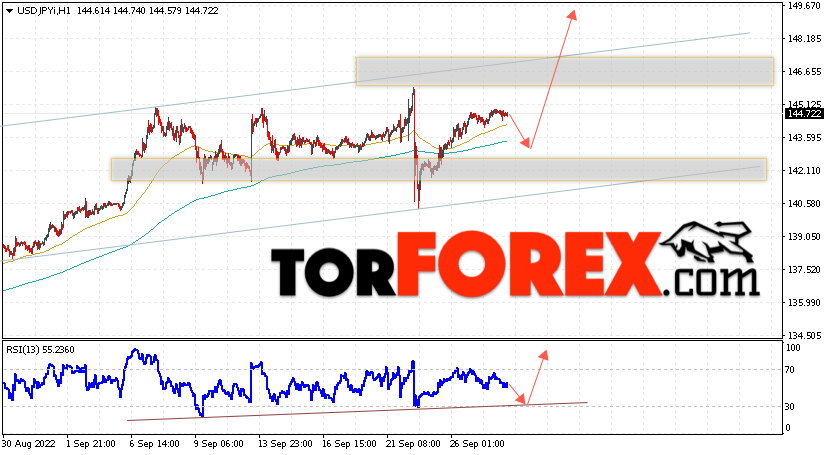 Котировки валютной пары Доллар Иена USD/JPY продолжают движение в коррекции бычьего канала. В момент публикации прогноза курс Доллара США к Японской Иене составляет 144.72. Цены постепенно подошли к уровню 145.00, который упорно защищает Банк Японии. Скользящие средние указывают на наличие краткосрочной бычьей тенденции по паре. Цены пробили область между сигнальными линиями вверх, что указывает на давление со стороны покупателей Доллара США и потенциальное продолжение роста цен уже с текущих уровней. В рамках прогноза курса Японской Иены на 29 сентября 2022 стоит ожидать попытку развития незначительной коррекции и тест области поддержки вблизи уровня 143.35. Далее, отскок цены вверх и продолжение роста пары USD/JPY в область выше уровня 149.65.