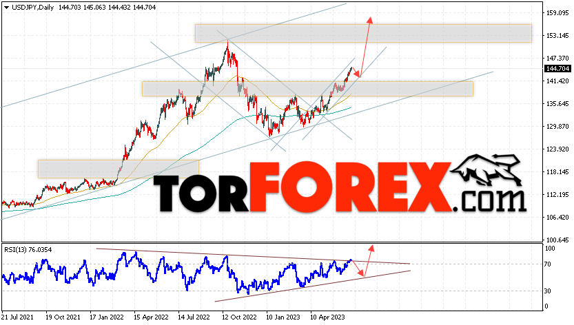 Дополнительным сигналом в пользу подъёма пары Доллар Иена на текущий торговой неделе выступит тест линии тренда на индикаторе относительной силы. Вторым сигналом станет отскок от нижней границы бычьего канала. Отменой варианта роста пары USD/JPY на текущей торговой неделе 3 — 7 июля 2023 выступит падение и пробой области 140.05. Такой вариант укажет на пробой области поддержки и продолжение падения пары на Форекс в область ниже уровня 136.75. Подтверждением росту по паре USD/JPY выступит пробой области сопротивления и закрытие цены над уровнем 147.95.