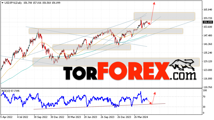 Дополнительным сигналом в пользу падения пары Доллар Иена на текущий торговой неделе выступит тест бычьей линии тренда на индикаторе относительной силы. Вторым сигналом станет отскок от нижней границы восходящего канала. Отменой варианта роста пары USD/JPY на текущей торговой неделе 3 — 7 июня 2024 выступит падение и пробой области 152.65. Такой вариант укажет на пробой области поддержки и продолжение падения пары на Форекс в область ниже уровня 149.75. Подтверждением росту по паре USD/JPY выступит пробой области сопротивления и закрытие цены над уровнем 160.25.
