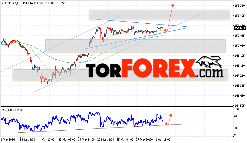 Котировки валютной пары Доллар Иена USD/JPY продолжают движение в рамках развития роста и формирования модели «Треугольник». В момент публикации прогноза курс Доллара США к Японской Иене составляет 151.65. Скользящие средние указывают на наличие краткосрочной бычьей тенденции по паре. Цены пробили область между сигнальными линиями вверх, что указывает на давление со стороны покупателей Доллара США и потенциальное продолжение роста цен уже с текущих уровней. В рамках прогноза курса Японской Иены на 3 апреля 2024 стоит ожидать попытку развития коррекции цены и тест области поддержки вблизи уровня 151.15. Далее, отскок цены вверх и продолжение роста пары USD/JPY в область выше уровня 153.75.