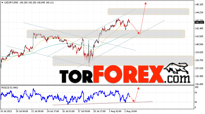 Котировки валютной пары Доллар Иена USD/JPY продолжают движение в рамках роста и бычьего канала. В момент публикации прогноза курс Доллара США к Японской Иене составляет 143.31. Скользящие средние указывают на наличие краткосрочной бычьей тенденции по паре. Цены пробили область между сигнальными линиями вверх, что указывает на давление со стороны покупателей Доллара США и потенциальное продолжение роста цен уже с текущих уровней. В рамках прогноза курса Японской Иены на 3 августа 2023 стоит ожидать попытку развития коррекции цены и тест области поддержки вблизи уровня 141.75. Далее, отскок цены вверх и продолжение роста пары USD/JPY в область выше уровня 146.45.