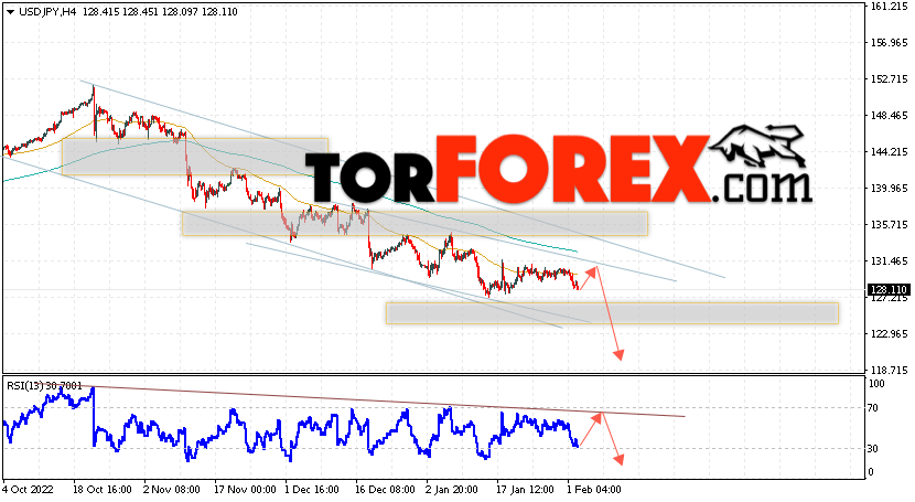 Котировки валютной пары Доллар Иена USD/JPY продолжают движение в рамках падения и нисходящего канала. В момент публикации прогноза курс Доллара США к Японской Иене составляет 128.11. Скользящие средние указывают на наличие краткосрочной медвежьей тенденции по паре. Цены пробили область между сигнальными линиями вниз, что указывает на давление со стороны продавцов Доллара США и потенциальное продолжение падения цен уже с текущих уровней. В рамках прогноза курса Японской Иены на 3 февраля 2023 стоит ожидать попытку развития бычьей коррекции и тест области сопротивления вблизи уровня 131.35. Далее, отскок цены вниз и продолжение падения пары USD/JPY в область ниже уровня 121.65.