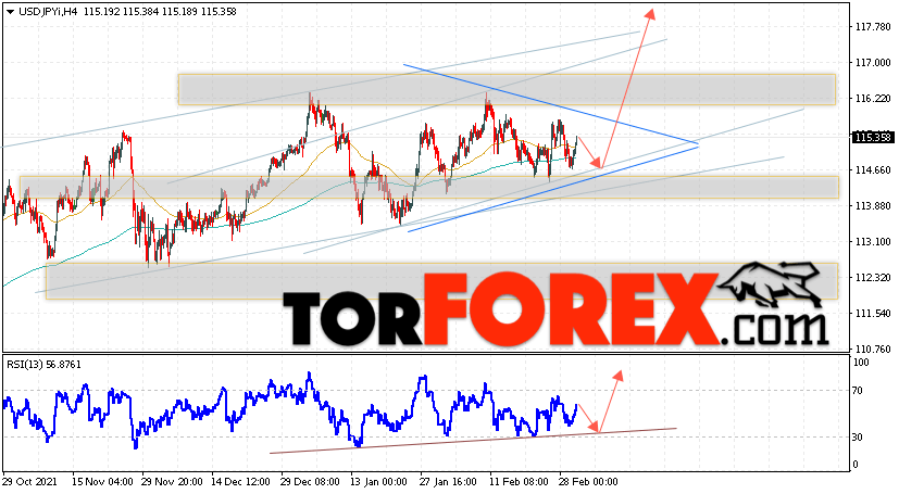 Таким образом, USD/JPY прогноз Доллар Иена на 3 марта 2022 предполагает попытку теста области поддержки вблизи уровня 114.65. Затем, продолжение роста котировок в область выше уровня 118.05. В пользу подъёма пары выступит тест линии тренда на индикаторе относительной силы. Отменой варианта роста станет падение и пробой области 113.65. Это укажет на пробой уровня поддержки и продолжение падения по паре с потенциальной целью ниже уровня 111.65.