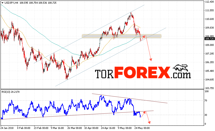 В пользу падения пары USD/JPY выступит тест линии тренда на индикаторе относительной силы. Отменой варианта падения пары Доллар Иена станет сильный рост и пробой уровня 109.55, что укажет на продолжение роста пары Доллар Иена с целью выше уровня 111.55. Ожидать подтверждения падения пары стоит с пробоем нижней границы восходящего канала и закрытием ниже уровня 108.20.