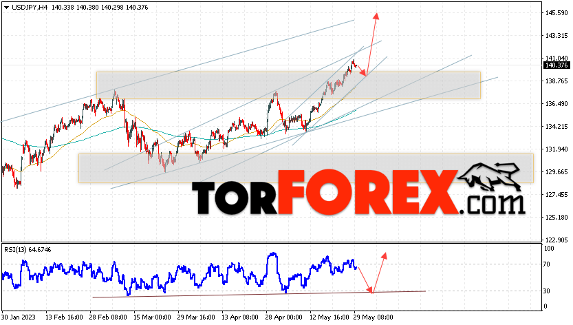 Котировки валютной пары Доллар Иена USD/JPY продолжают движение в рамках роста и бычьего канала. В момент публикации прогноза курс Доллара США к Японской Иене составляет 140.37. Скользящие средние указывают на наличие краткосрочной бычьей тенденции по паре. Цены пробили область между сигнальными линиями вверх, что указывает на давление со стороны покупателей Доллара США и потенциальное продолжение роста цен уже с текущих уровней. В рамках прогноза курса Японской Иены на 30 мая 2023 стоит ожидать попытку развития коррекции цены и тест области поддержки вблизи уровня 138.85. Далее, отскок цены вверх и продолжение роста пары USD/JPY в область выше уровня 145.45.