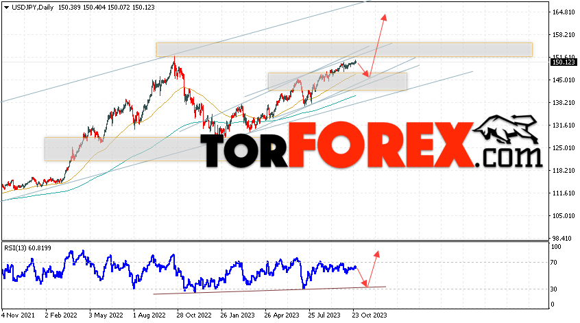 Дополнительным сигналом в пользу подъёма пары Доллар Иена на текущий торговой неделе выступит тест бычьей линии тренда на индикаторе относительной силы. Вторым сигналом станет отскок от нижней границы бычьего канала. Отменой варианта роста пары USD/JPY на текущей торговой неделе 30 октября — 3 ноября 2023 выступит падение и пробой области 142.45. Такой вариант укажет на пробой области поддержки и продолжение падения пары на Форекс в область ниже уровня 138.25. Подтверждением росту по паре USD/JPY выступит пробой области сопротивления и закрытие цены над уровнем 153.05.