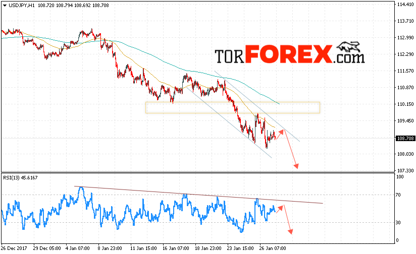 Таким образом, USD/JPY прогноз Доллар Иена на 30 января 2018 предполагает попытку теста верхней границы нисходящего канала вблизи области 108.90 и продолжения падения в область ниже уровня 107.60, в пользу падения выступит тест линии тренда на индикаторе относительной силы.