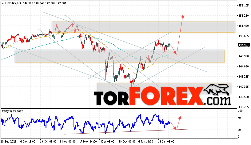 Котировки валютной пары Доллар Иена USD/JPY продолжают движение в рамках развития роста и бычьего канала. В момент публикации прогноза курс Доллара США к Японской Иене составляет 147.98. Скользящие средние указывают на наличие краткосрочной бычьей тенденции по паре. Цены пробили область между сигнальными линиями вверх, что указывает на давление со стороны покупателей Доллара США и потенциальное продолжение роста цен уже с текущих уровней. В рамках прогноза курса Японской Иены на 30 января 2024 стоит ожидать попытку развития коррекции цены и тест области поддержки вблизи уровня 145.85. Далее, отскок цены вверх и продолжение роста пары USD/JPY в область выше уровня 153.35.