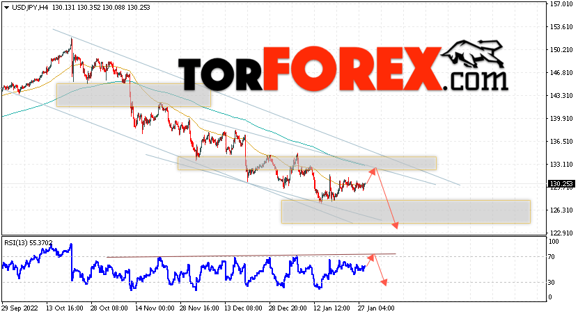 Котировки валютной пары Доллар Иена USD/JPY продолжают движение в рамках коррекции и нисходящего канала. В момент публикации прогноза курс Доллара США к Японской Иене составляет 130.25. Скользящие средние указывают на наличие краткосрочной медвежьей тенденции по паре. Цены вновь тестируют область между сигнальными линиями, что указывает на давление со стороны продавцов Доллара США и потенциальное продолжение падения цен уже с текущих уровней. В рамках прогноза курса Японской Иены на 31 января 2023 стоит ожидать попытку развития бычьей коррекции и тест области сопротивления вблизи уровня 130.85. Далее, отскок цены вниз и продолжение падения пары USD/JPY в область ниже уровня 123.15.