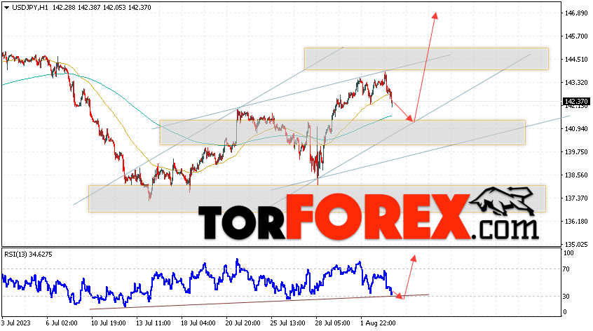 Котировки валютной пары Доллар Иена USD/JPY продолжают движение в рамках роста и бычьего канала. В момент публикации прогноза курс Доллара США к Японской Иене составляет 142.37. Скользящие средние указывают на наличие краткосрочной бычьей тенденции по паре. Цены пробили область между сигнальными линиями вверх, что указывает на давление со стороны покупателей Доллара США и потенциальное продолжение роста цен уже с текущих уровней. В рамках прогноза курса Японской Иены на 4 августа 2023 стоит ожидать попытку развития коррекции цены и тест области поддержки вблизи уровня 141.15. Далее, отскок цены вверх и продолжение роста пары USD/JPY в область выше уровня 146.95.