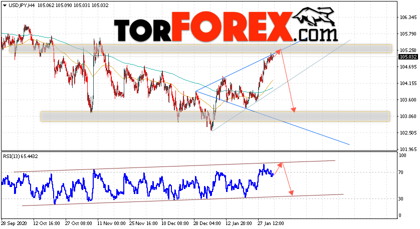 Таким образом, USD/JPY прогноз Доллар Иена на 4 февраля 2021 предполагает попытку теста области сопротивления вблизи уровня 105.25. Затем, продолжение падения котировок в область ниже уровня 103.05. В пользу снижения пары выступит тест линии тренда на индикаторе относительной силы. Отменой варианта падения станет сильный рост и пробой области 105.85. Это укажет на пробой уровня сопротивления и продолжение подъёма по паре с потенциальной целью выше уровня 107.85.