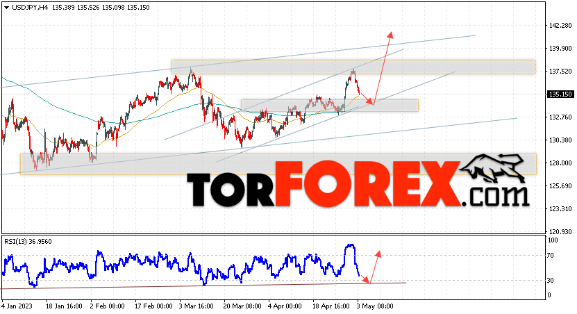 Котировки валютной пары Доллар Иена USD/JPY продолжают движение в рамках сильной нисходящей коррекции и бычьего канала. В момент публикации прогноза курс Доллара США к Японской Иене составляет 135.15. Скользящие средние указывают на наличие краткосрочной бычьей тенденции по паре. Цены пробили вверх область между сигнальными линиями, что указывает на давление со стороны покупателей Доллара США и потенциальное продолжение роста цен уже с текущих уровней. В рамках прогноза курса Японской Иены на 4 мая 2023 стоит ожидать попытку развития снижения цены и тест области поддержки вблизи уровня 134.45. Далее, отскок цены вверх и продолжение роста пары USD/JPY в область выше уровня 140.75.