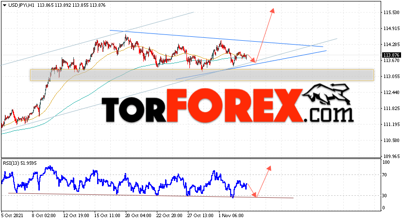 Котировки валютной пары Доллар Иена USD/JPY продолжают движение в рамках коррекции и формирования модели ”Треугольник”. В момент публикации прогноза курс Доллара США к Японской Иене составляет 113.87. Скользящие средние указывают на наличие краткосрочной бычьей тенденции по паре. Цены пробили область между сигнальными линиями вверх, что указывает на давление со стороны покупателей Доллара США и потенциальное продолжение подъёма цен уже с текущих уровней. В рамках прогноза курса Японской Иены на 4 ноября 2021 стоит ожидать попытку развития медвежьей коррекции и тест области поддержки вблизи уровня 113.55. Далее, отскок вверх и продолжение подъёма пары USD/JPY в область выше уровня 115.65.