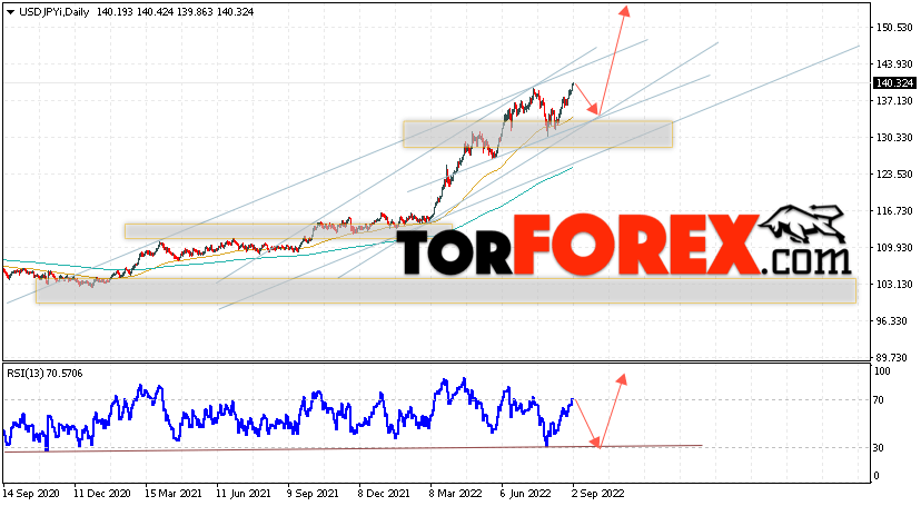 Дополнительным сигналом в пользу роста пары Доллар Иена на текущий торговой неделе выступит тест бычьей линии тренда на индикаторе относительной силы. Вторым сигналом станет отскок от нижней границы бычьего канала. Отменой варианта подъёма пары USD/JPY на текущей торговой неделе 5 — 9 сентября 2022 выступит падение и пробой области 128.35. Такой вариант укажет на пробой области поддержки и продолжение падения пары на Форекс в область ниже уровня 124.25. Подтверждением росту по паре USD/JPY выступит пробой области сопротивления и закрытие цены над уровнем 143.65, что укажет на пробой верхней границы бычьего канала.