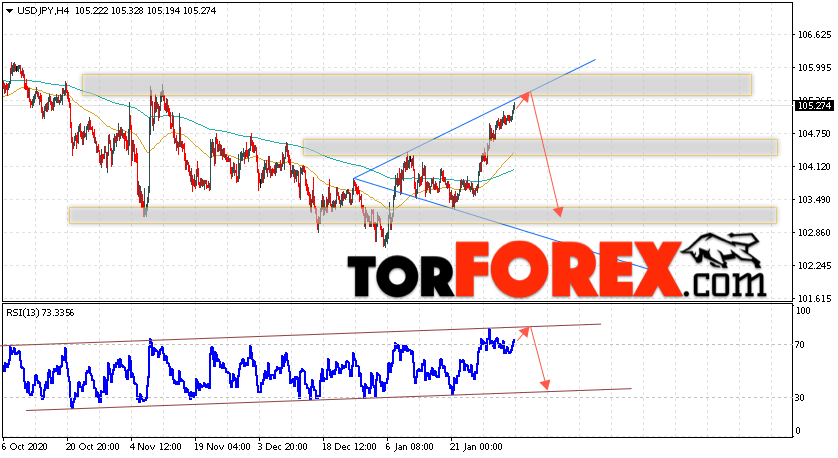 Таким образом, USD/JPY прогноз Доллар Иена на 5 февраля 2021 предполагает попытку теста области сопротивления вблизи уровня 105.65. Затем, продолжение падения котировок в область ниже уровня 103.25. В пользу снижения пары выступит тест линии тренда на индикаторе относительной силы. Отменой варианта падения станет сильный рост и пробой области 106.25. Это укажет на пробой уровня сопротивления и продолжение подъёма по паре с потенциальной целью выше уровня 107.95.