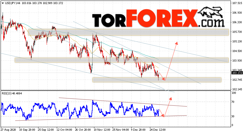 Таким образом, USD/JPY прогноз Доллар Иена на 5 января 2021 предполагает попытку теста области поддержки вблизи уровня 102.75. Затем, продолжение роста котировок в область выше уровня 105.15. В пользу подъёма пары выступит тест линии тренда на индикаторе относительной силы. Отменой варианта роста станет падение и пробой области 102.05. Это укажет на пробой уровня поддержки и продолжение падения по паре с потенциальной целью ниже уровня 100.15.